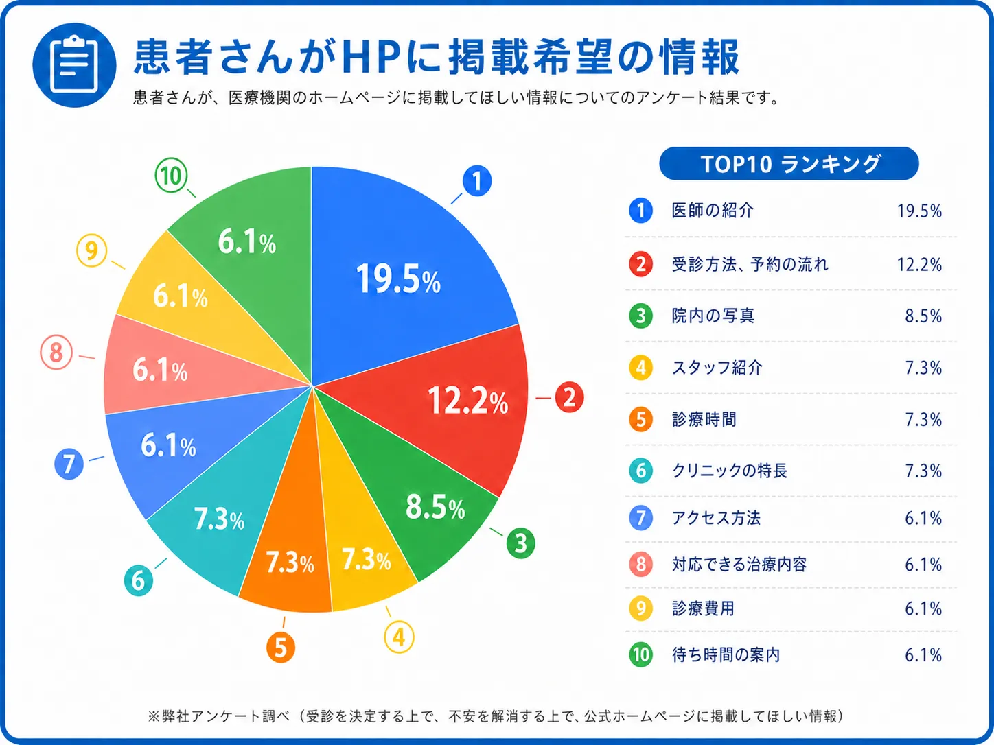 一般的にHP制作会社の多くは、おしゃれなデザインのホームページを提案しますが、「MORE-HP」ではアンケートから判明した患者さんが求めている下記情報にのみ絞って設計をしています。